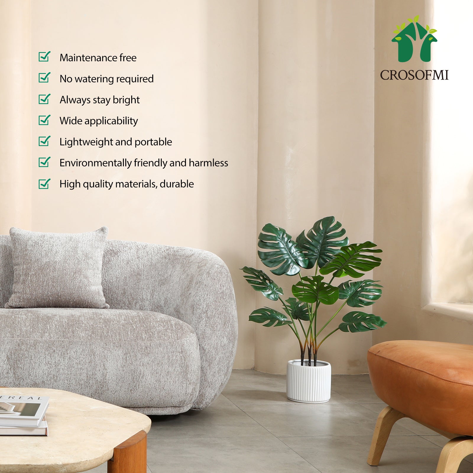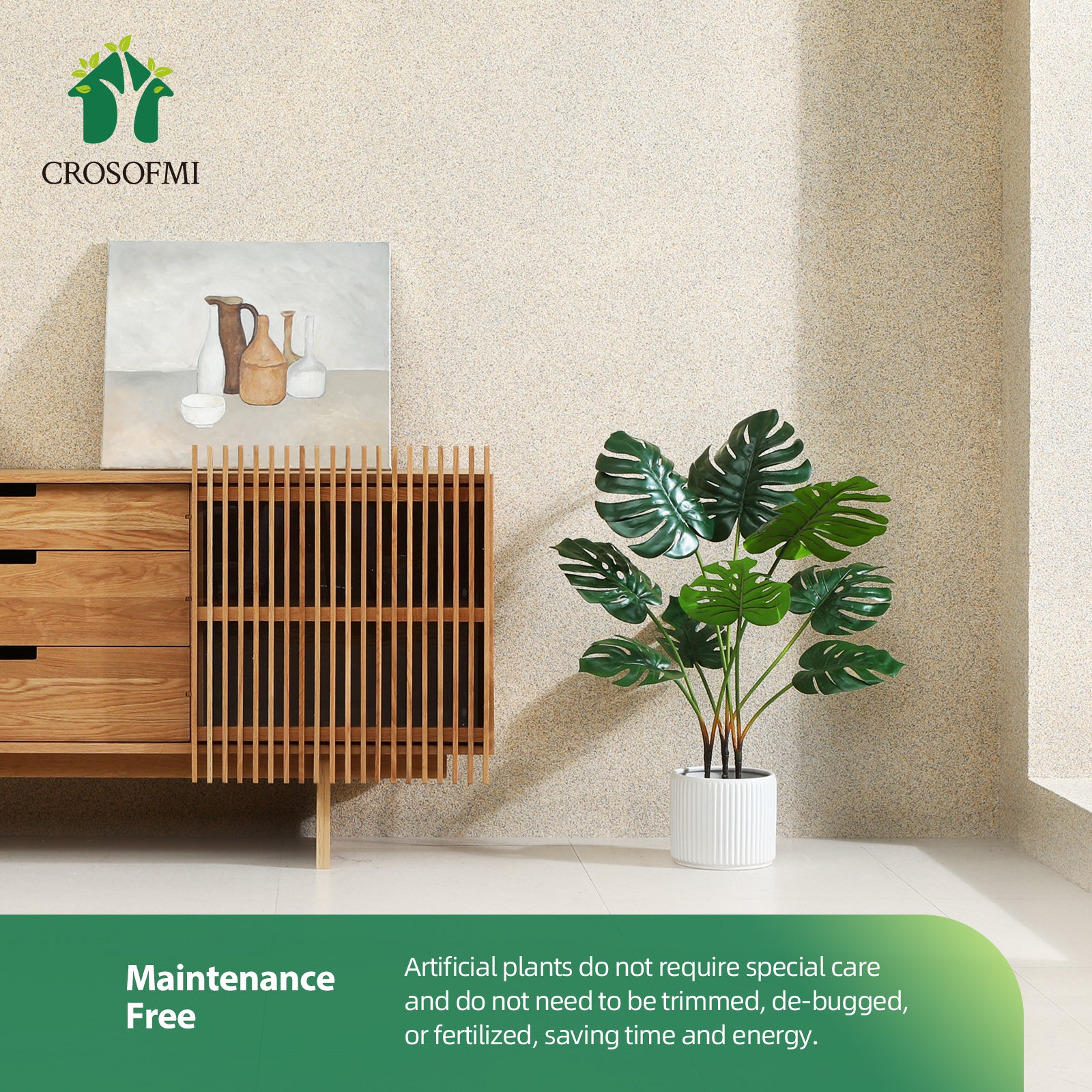- STURDY AND ADJUSTABLE:Our monstera deliciosa plant outfitted with sturdy inner metal wires, you can adjust the trunk to the shape you like, without worrying that the trunk will break.This artificial plant will maintain its height, color and shape for years without pruning and shaping to ensure the aesthetic is maintained.