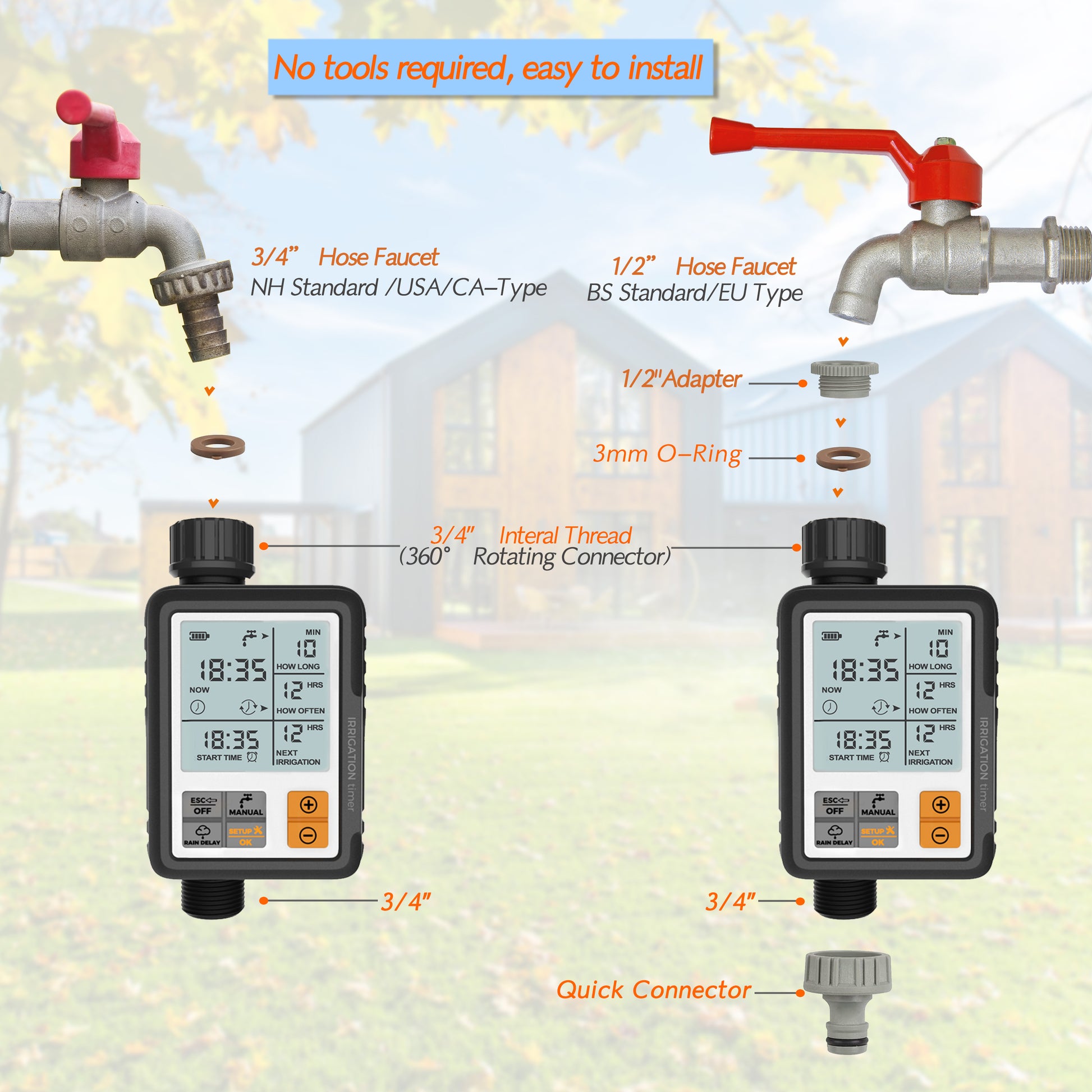 - ALL-IN-ONE LARGE SCREEN&OVER 6 MONTHS WORKING TIME: 3″ extra-large HD screen make everything clear at a glance. What’s more? Much power could be saved as the screen will go sleep automatically if soaker hose timer not operated after 30s.The powerful chip will detect low power supply and shut off hose timer before battery dead.Only 2x1.5 V AA Alkaline batteries must be used(Not Included)