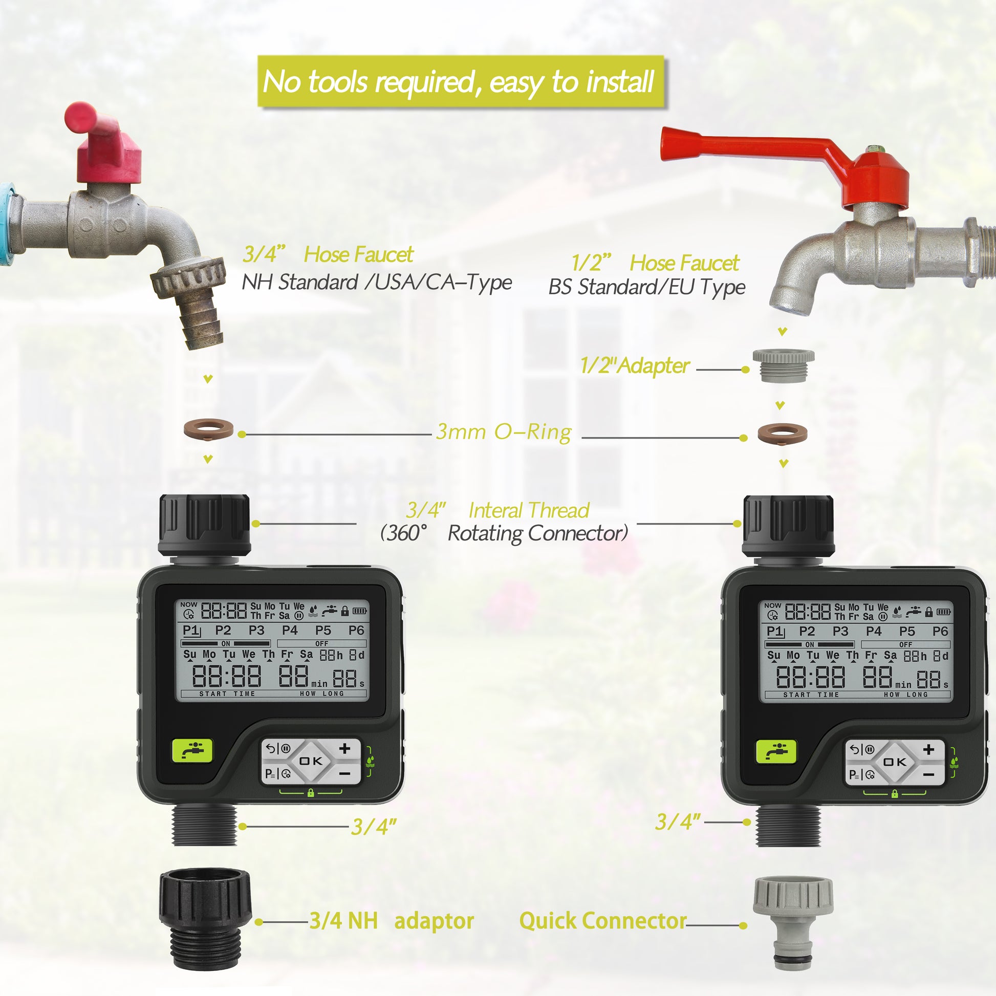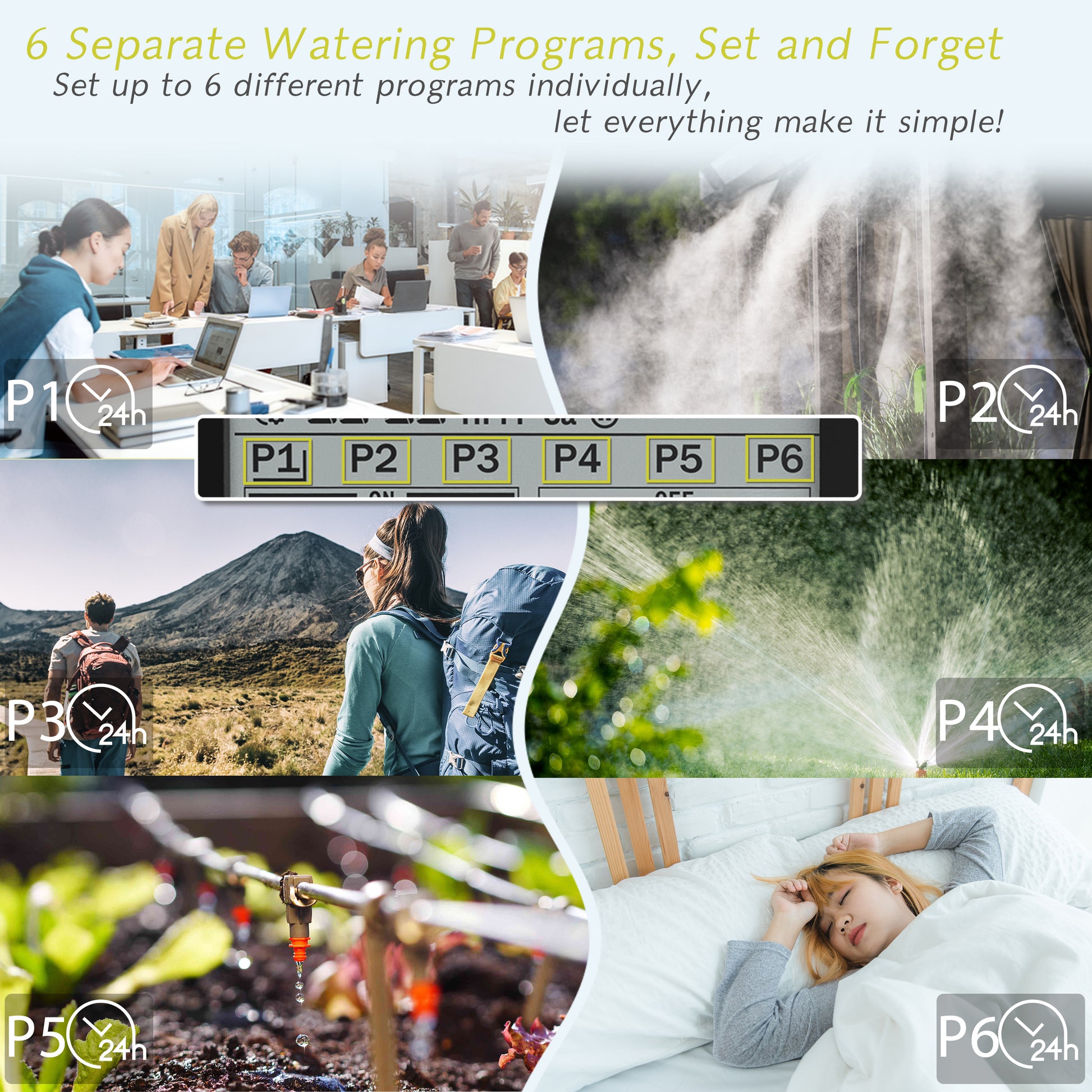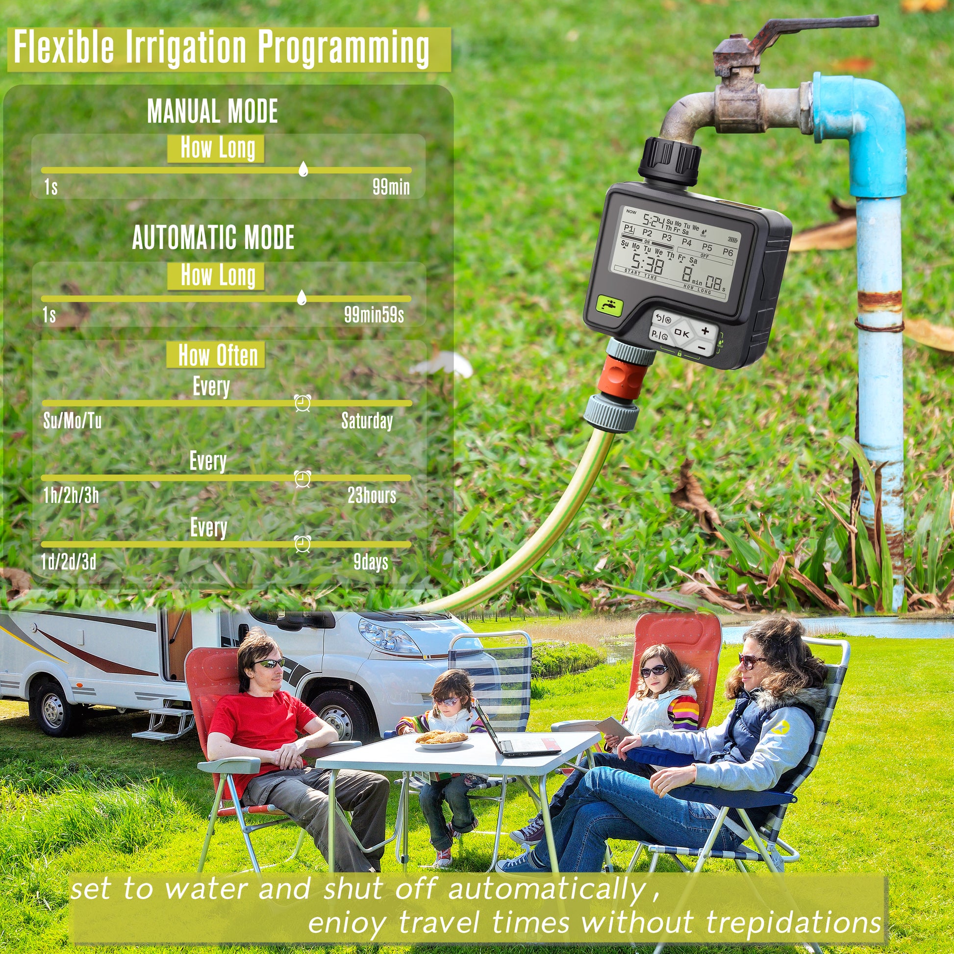- 【6 Individual Irrigation Modes】: The Sprinkler Timer provides 6 separate watering programs to meet your different demands, set each watering schedule with customized irrigation frequency and duration. Set week cycle mode (from Monday to Sunday) and day cycle mode (from 1hr to 9 days) and the run time from 1s to 99min 59s, and the intervals from every 1 hour to every 15 days, which will ensure your watering schedule fully cooperate with the rule of plant growth and make them growing up .