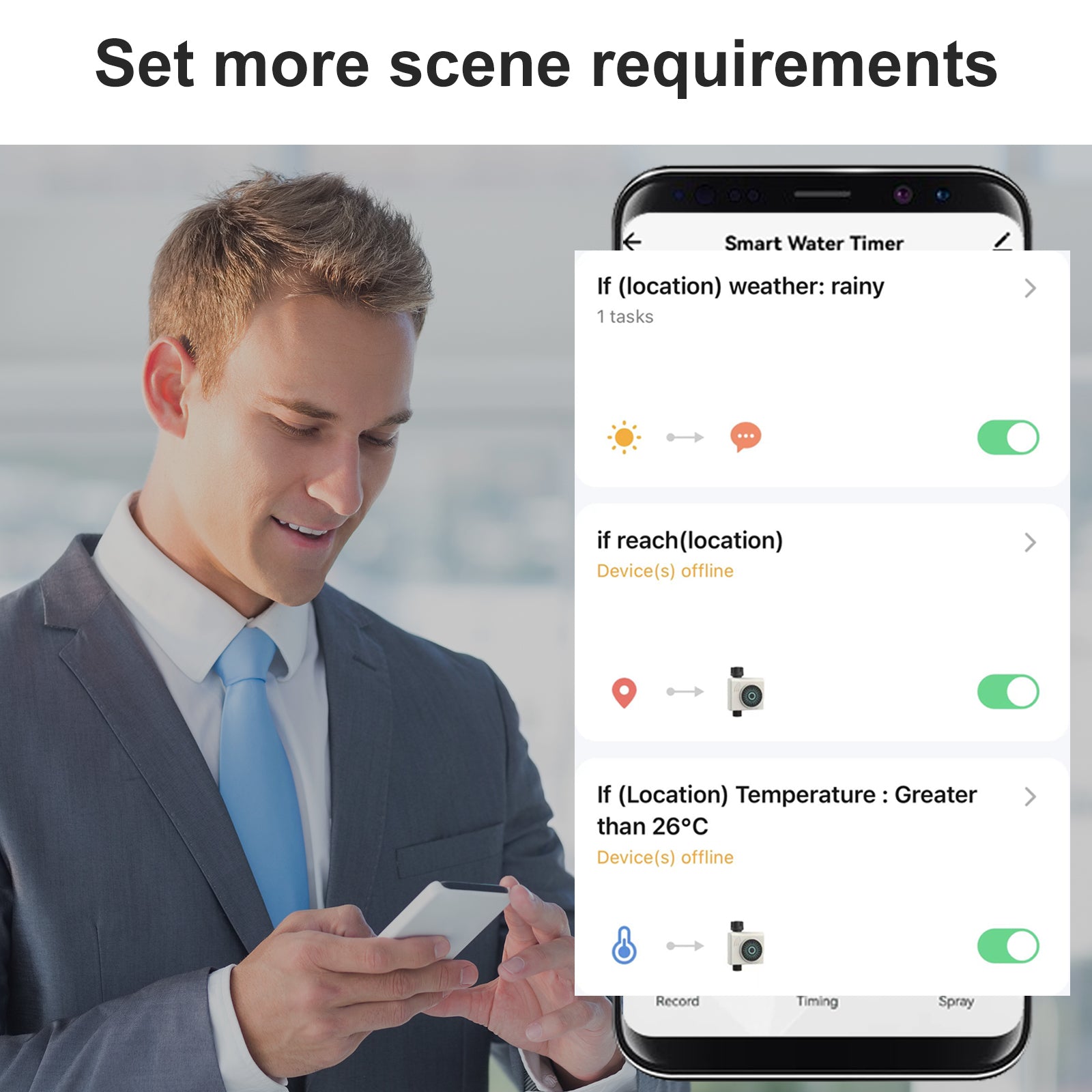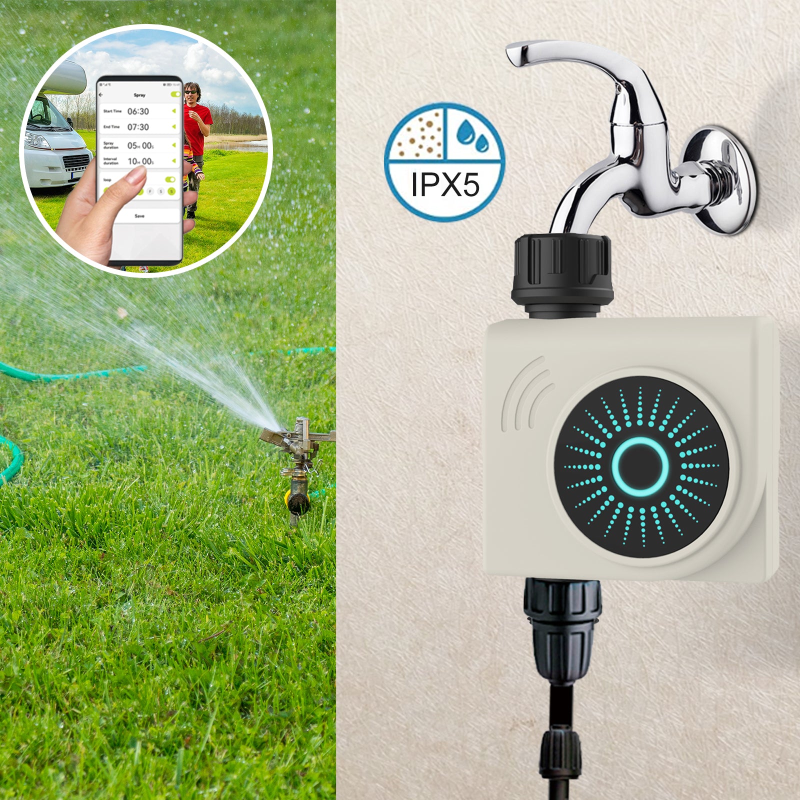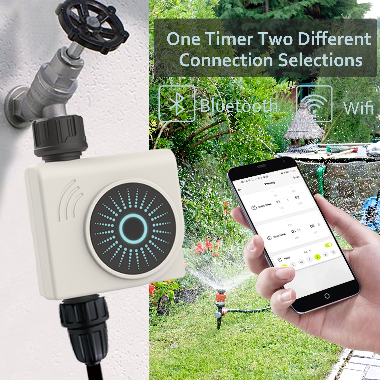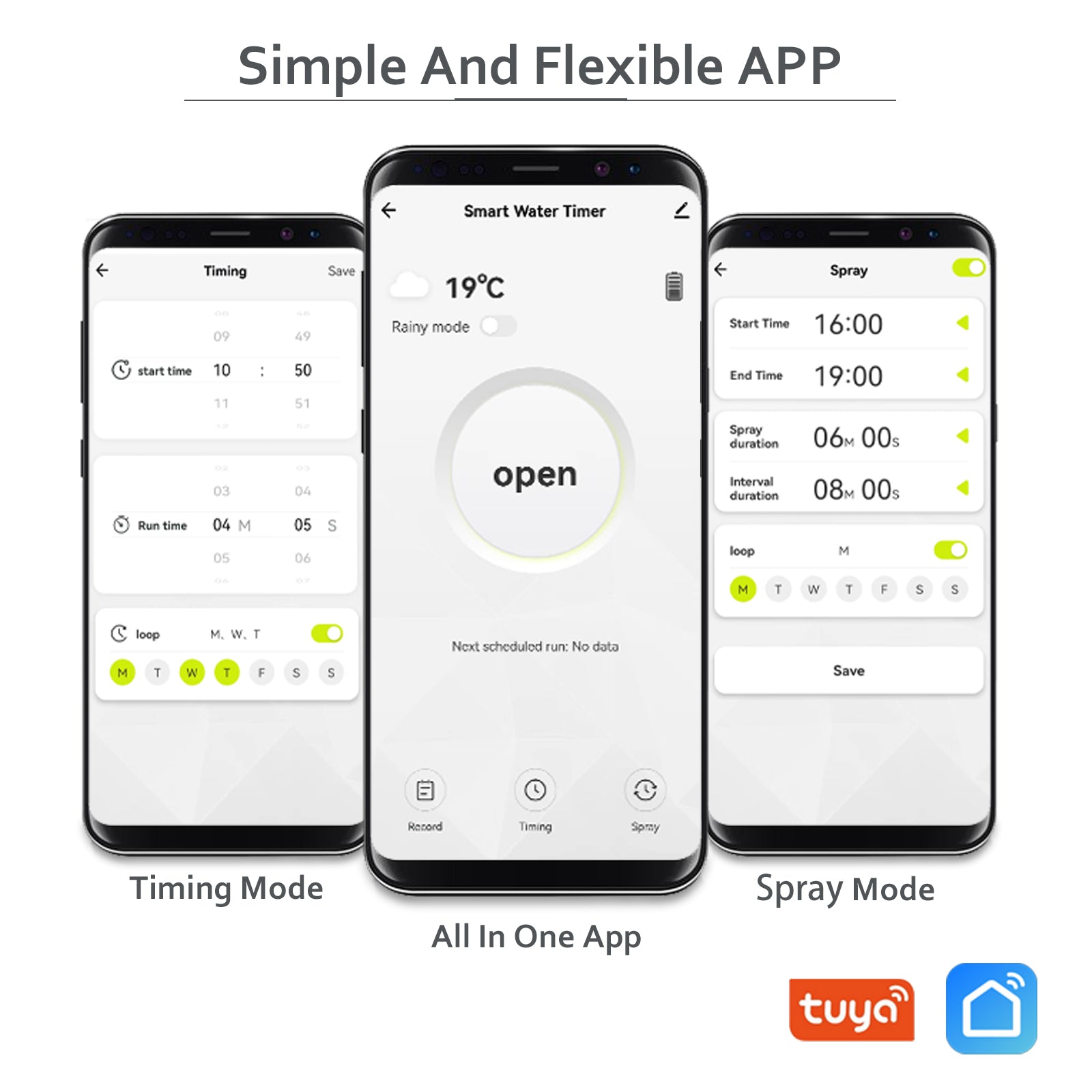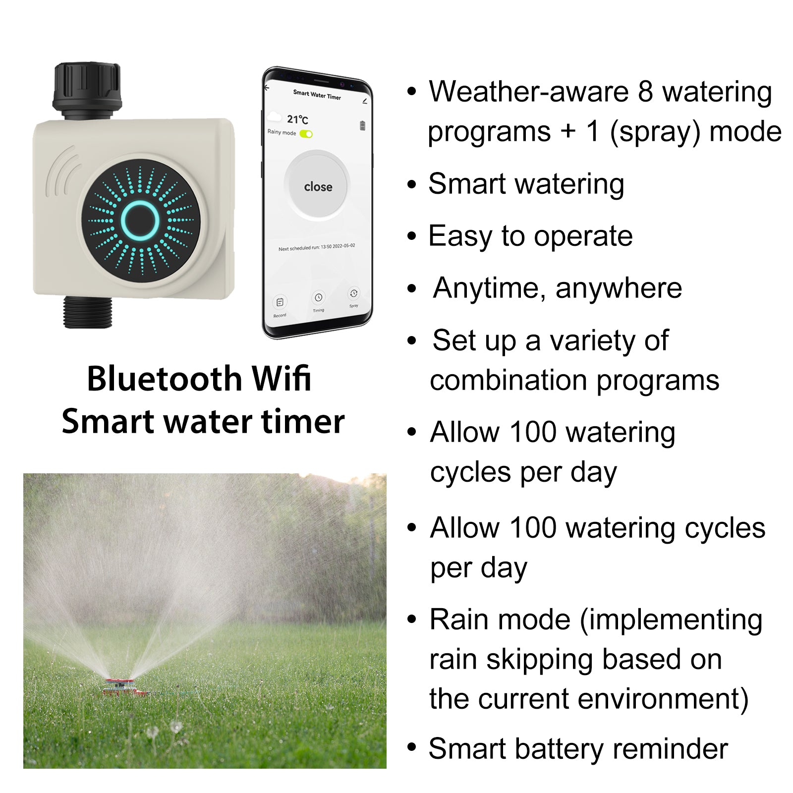 - SPRINKLER MODE + SPRAYER MODE - For various watering demands in different weather, seasons, reasons, and situations, we incorporated sprinkler and sprayer modes in this WiFi hose timer. You can configure up to 8 unique sprinkler programs and 1 independent sprayer program. You can modify the timetable to match your demands, whether you want to irrigate your garden, lawn, potted plants, greenhouse veggies, humidify and dust the surroundings, or fill your pool.